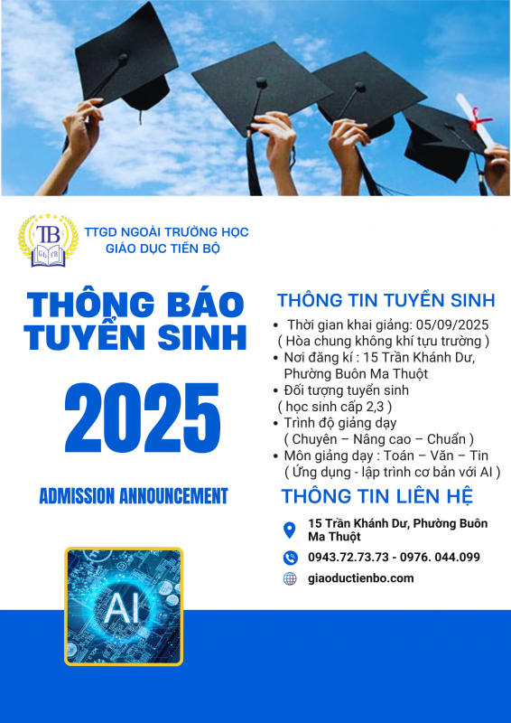 Trung tâm Giáo dục Tiến Bộ là trung tâm dạy thêm, học thêm uy tín hàng đầu tại TP. Buôn Ma Thuột, chuyên cung cấp các chương trình dạy thêm chất lượng cao cho học sinh THCS và THPT. Với đội ngũ giáo viên giàu kinh nghiệm và phương pháp giảng dạy hiện đại, trung tâm cam kết mang đến môi trường học tập hiệu quả, giúp học sinh nắm vững kiến thức và phát triển kỹ năng toàn diện. Ngoài ra, trung tâm còn chú trọng đến việc tư vấn và định hướng học tập, hỗ trợ học sinh đạt được mục tiêu học tập và chuẩn bị tốt cho các kỳ thi quan trọng.