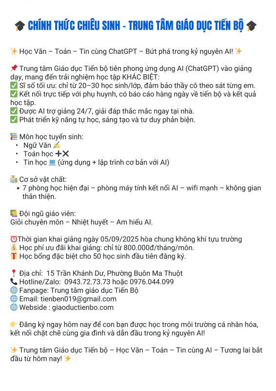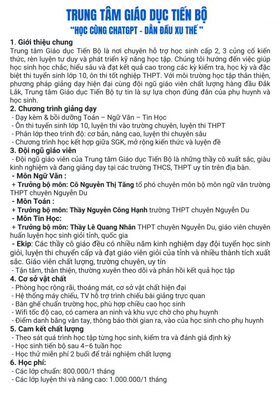 Trung tâm Giáo dục Tiến Bộ là trung tâm dạy thêm, học thêm uy tín hàng đầu tại TP. Buôn Ma Thuột, chuyên cung cấp các chương trình dạy thêm chất lượng cao cho học sinh THCS và THPT. Với đội ngũ giáo viên giàu kinh nghiệm và phương pháp giảng dạy hiện đại, trung tâm cam kết mang đến môi trường học tập hiệu quả, giúp học sinh nắm vững kiến thức và phát triển kỹ năng toàn diện. Ngoài ra, trung tâm còn chú trọng đến việc tư vấn và định hướng học tập, hỗ trợ học sinh đạt được mục tiêu học tập và chuẩn bị tốt cho các kỳ thi quan trọng.